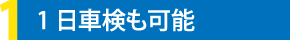 | お忙しい方、車を空けられない方向けに1日で仕上げる1日車検コースもご用意しております。状況にもよりますが、基本的に事前の準備があって初めて1日でお渡し可能となるサービスですので、1日車検をお考えの方は、お早めのご相談・ご予約をお願い致します。 |